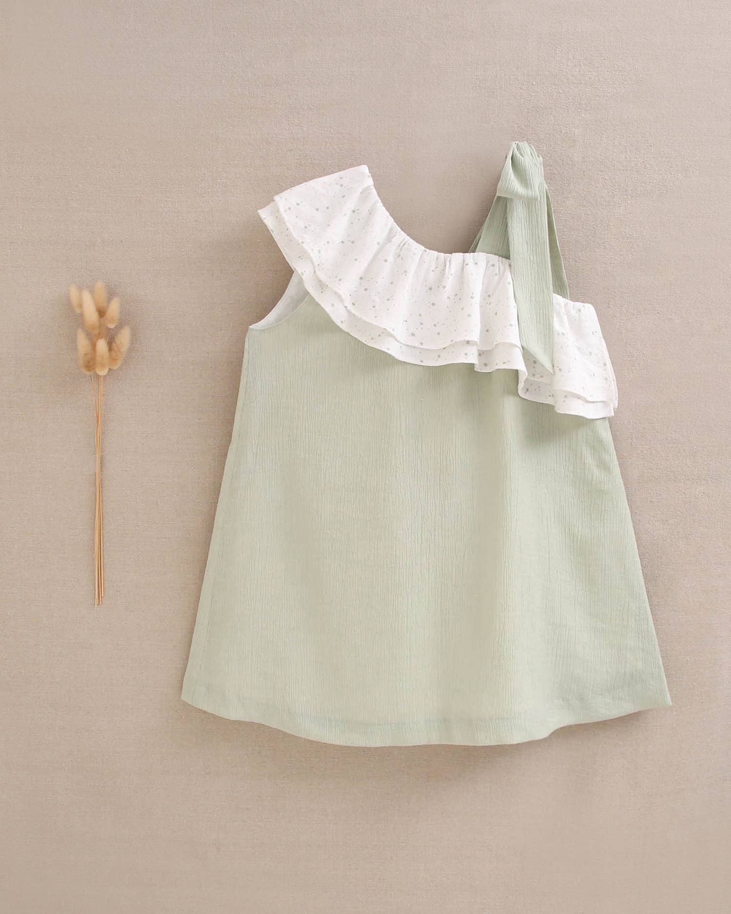 Abito da bambina verde pastello con volant asimmetrico bianco sulla spalla e fiocco sulla spallina.