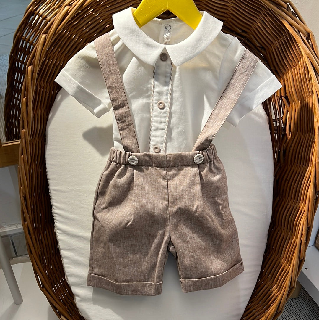 composto da Pantaloncino con bretelle sabbia ,Camicia manica corta con dettagli sabbia