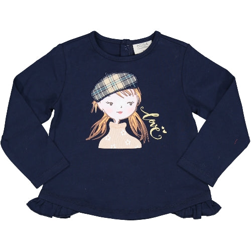 Maglietta manica lunga blu con stampa sul fronte ragazza dai capelli arancio, rouches sul fondo