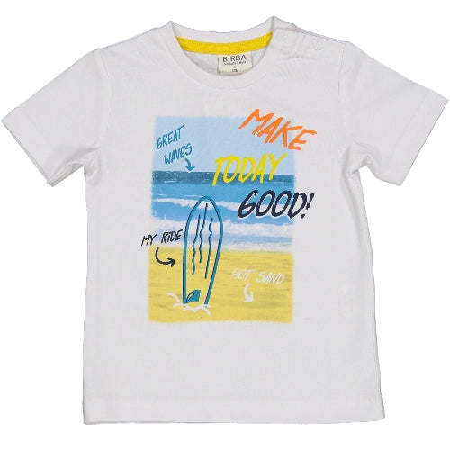 Comoda e fresca maglietta manica corta bianca con stampa colorata di una spiaggia con tavola da serf