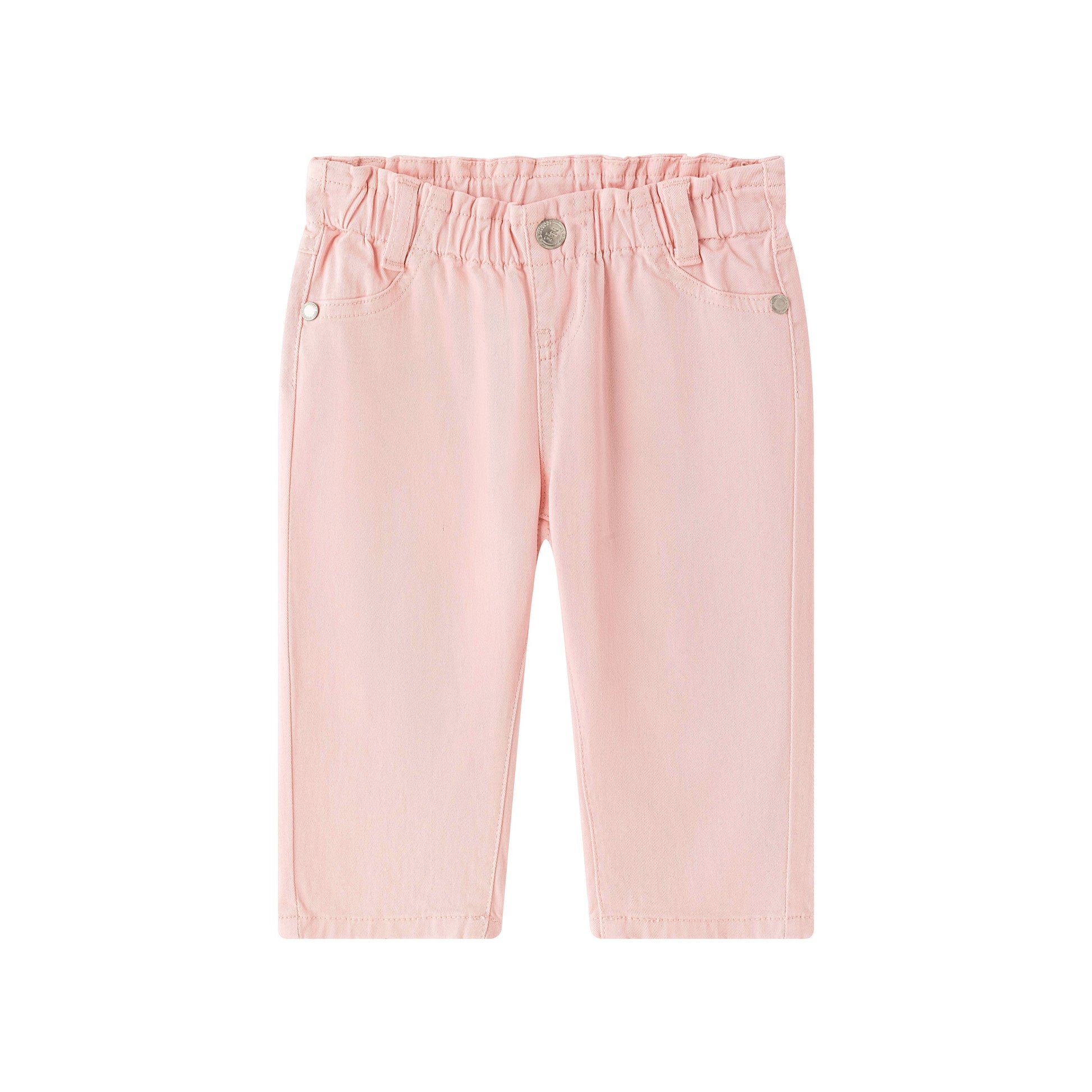 Pantalone lungo in denim per bambina, a cinque tasche con fiocco e vita alta elasticizzata, di colore rosa. Abbigliamento per bambina. Realizzato in 98% Cotone; 2% Elastan