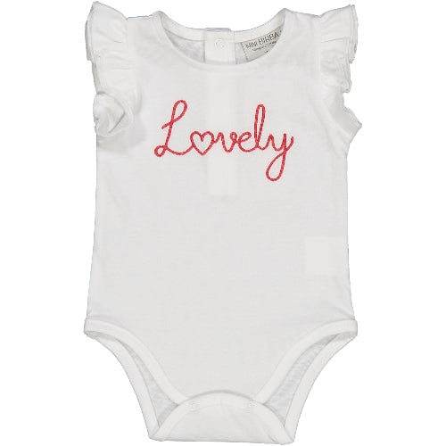top bianco 100% cotone con scritta rossa Lovely e arricciatura sulla spalla.