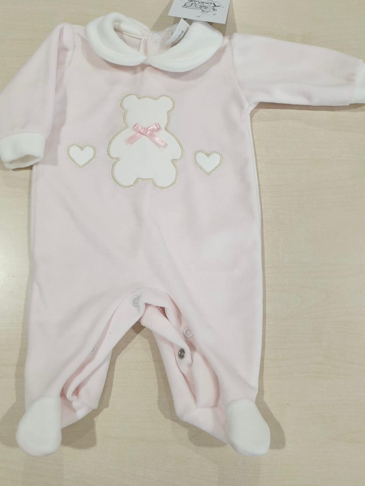 Tutina per neonata in ciniglia con piedini, rosa con colletto e polsini bianchi, presenta un morbido orsetto frontale .