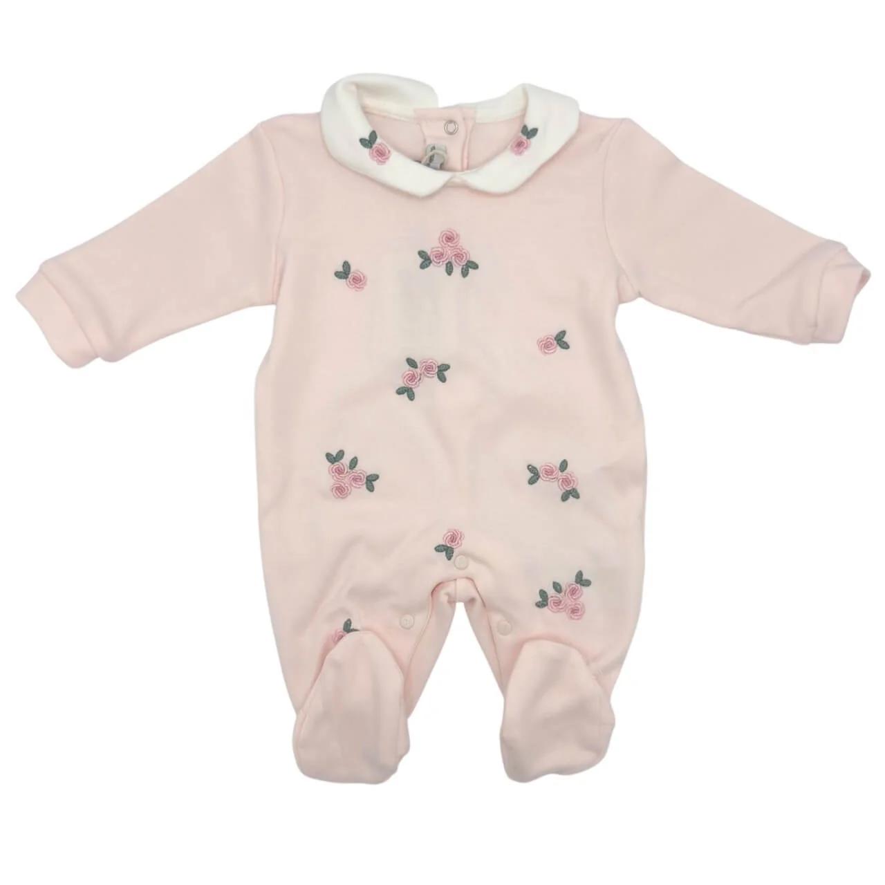 Tutina per neonata in caldo cotone con piedini, color rosa cipria con colletto onda bianco , presenta ricami di roselline delicate sul fronte della tutina e sul colletto.