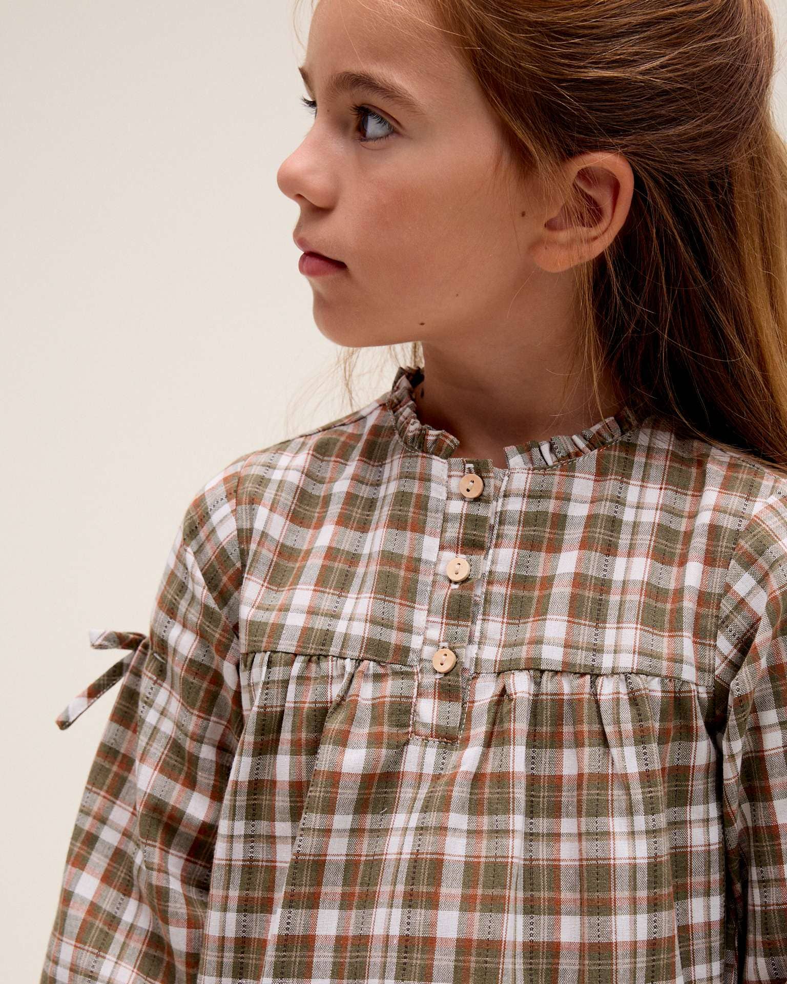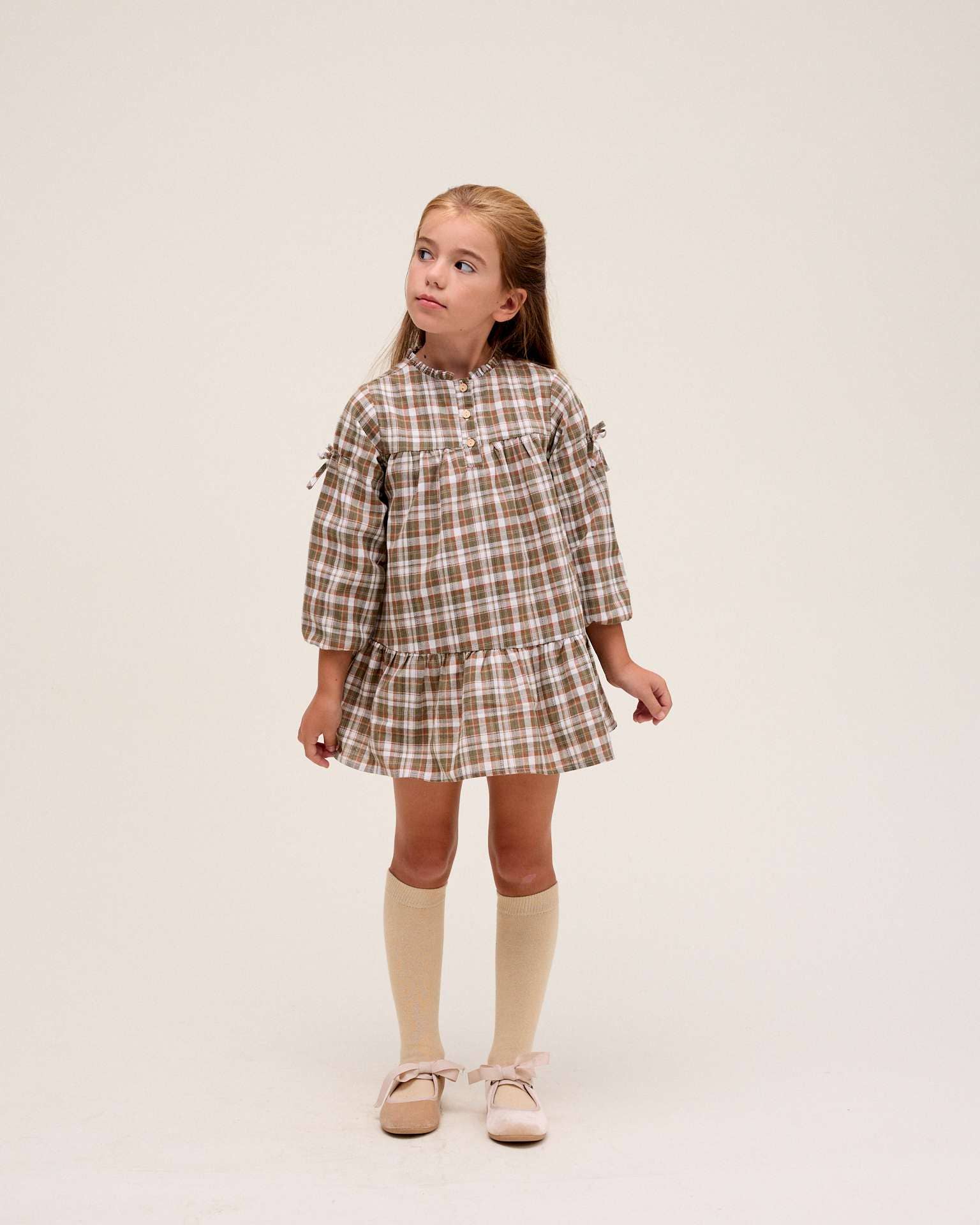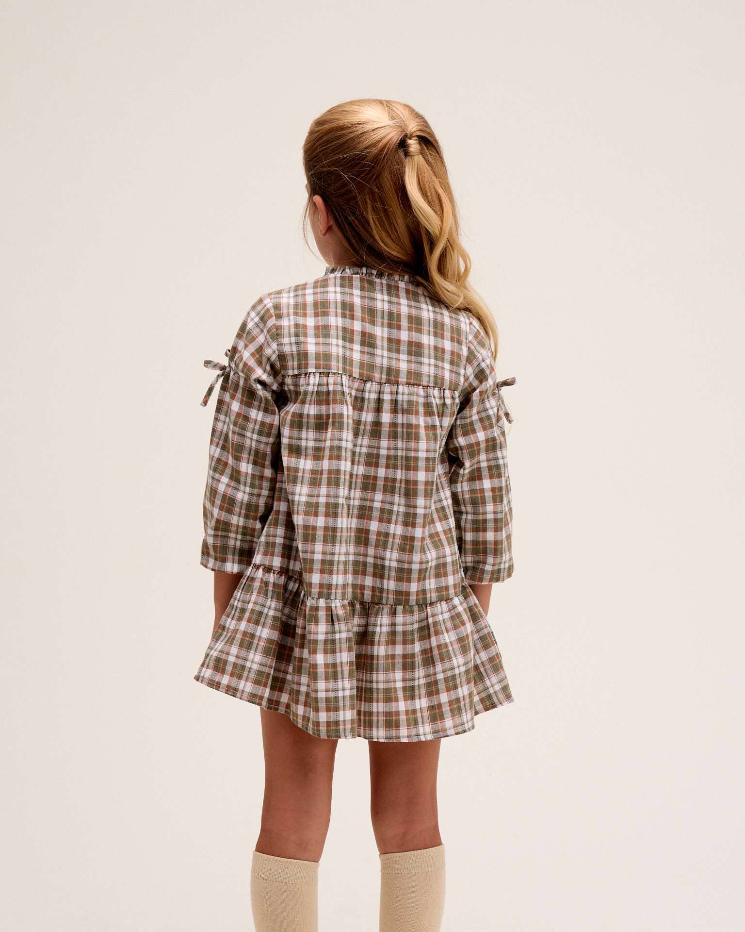 Abito per bambina a trapezio a maniche lunghe a quadri color terracotta, verde e bianco. Collo rotondo con arricciatura. Dettaglio di fiocchi sulle maniche. Polsino elastico. Fodera interna e chiusura anteriore con bottoni in legno.